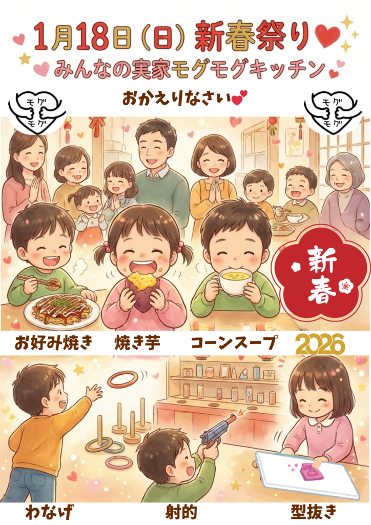 月16日(金)「ひとり親世帯応援隊」開催✨❤️ みんなの実家モグモグキッチンで、心もお腹もポカポカ温… 続きを読む: 2026年1月16日 ひとり親世帯応援隊 - 2026年1月9日 モグデリ(子育て世帯応援隊)